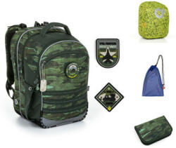 Kedvezményes árú iskolatáska szett tolltartóval, cipőzsákkal és esővédővel. A szett az alábbi termékeket tartalmazza: COCO 23040 - Terepmintás iskolatáska, PENN 23040 - Tolltartó, ZUZA 19046 - Iskolai zsák, ZIGI 17001 - Esővédő