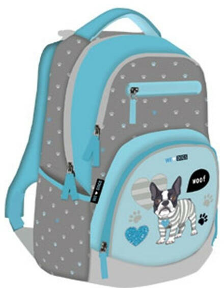 Hátizsák LIZZY CARD Active+ We Love Woof Kiváló minőségő iskolai hátizsák főképpen 3. és 4. osztályosok részére, puha, szivacsos hátrész, mely megkíméli a gerincet, két nagy tárolórész, belül laptoptartó, elülső két kisebb tárolórészben apró zsebek iratoknak, telefonnak, apróságoknak, oldalzseb a kulacsnak.