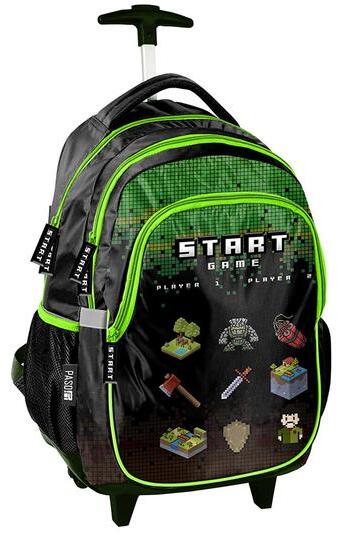 A Game gurulós iskolatáska, hátizsák - Start praktikus, gerinckímélő megoldást kínál az iskolás korosztály számára. A könyvek, füzetek és a tolltartó 3 különböző méretű rekeszbe pakolhatók. Kétoldalt egy-egy kis hálós zsebben tárolható az innivaló. Strapabíró, dupla gumi kerekeken gurul. A hátizsák fém húzóját a fogantyún lévő gomb megnyomásával lehet ki