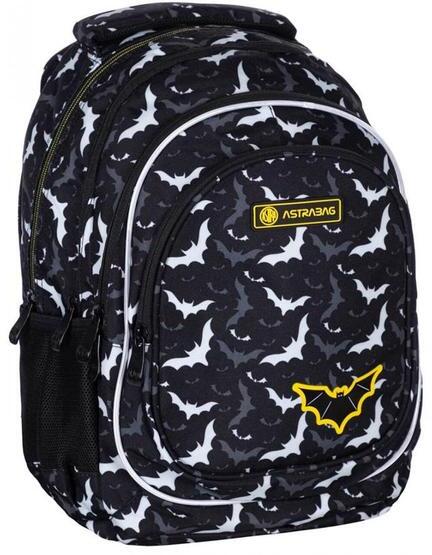 A Night Bats 4 rekeszes iskolatáska, hátizsák a kisiskolás fiúknak készült. A fekete alapon szürke és fehér denevér mintával dekorált design hátizsák 4 cipzáras rekesszel és két oldalsó hálós zsebbel rendelkezik. Hátoldala merevített, ergonomikus kialakí tású, vállpántja állítható hosszúságú, szintén szivacsos borítással. A mellkaspánt leveszi a gyermek váll