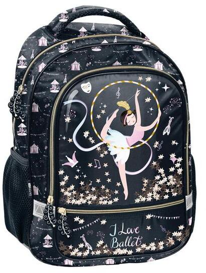 Balerina hátizsák, iskolatáska - Black-Gold elején gyönyörű táncoló kislánnyal. Az iskolai felszerelést két különböző méretű, cipzáras zsebbe lehet pakolni. Elején egy kisebb zseb található, kétoldalt egy-egy hálós zseb ben tárolható például az üdítős kulacs. A táska kézben és háton is kényelmesen hordható, hátoldala szivacsos, profilozott kialakítású. Ál