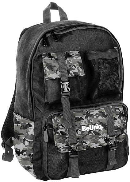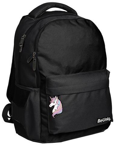 Nagyméretű BeUniq hátizsák - 2 rekeszes - Unicorn a nagyobb korosztály számára. A fekete, egyszínű hátizsák 2 nagyobb rekesszel, elején 1 kisebb méretű cipzáras zsebbel, valamint mindkét oldalán hálós oldalzsebbel rendelkezik. Hátoldala enyhén merevített, vállpántja állítható és szivacsos. A táska diszkrét fényvisszaverőkkel ellátott, valamint cipzárját unikornis