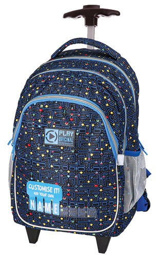 Hátitáska gurulós Play Trolley videó játék kék Ez a háromszor varrott hátizsák vízálló anyagból készült, magas minőségű poliészterből. A teleszkópos fogantyú két szinten állítható, és a reflektív biztonsági sávok még sötétben is láthatóvá teszik. A párnázott vállpántok kényelmes viseletet biztosítanak, és a kiegészítő biztonsági csat további védelm