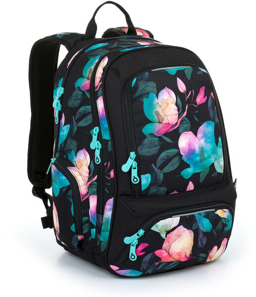 Tágas, kétrekeszes hátizsák praktikus fekete színben tarka virágokkal. A puhán párnázott, ergonomikus kialakítású hátrészt könnyű, de erős alumínium lap merevíti. A hátsó rekeszben van egy párnázott zseb egy laptop és tablet számára, valamint egy másik kisebb zseb mobiltelefon vagy powerbank számára. A hátizsák a két rekesz mellett két elülső zsebbel rendelkezik,
