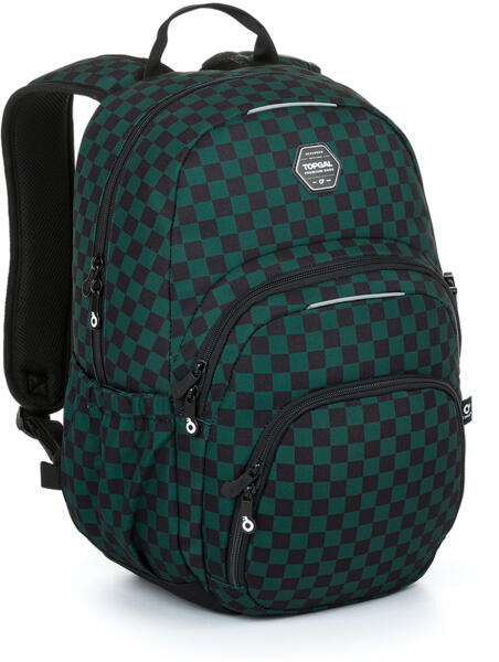 Egyrekeszes diákhátizsák zöld színű sakktábla mintával. A puhán párnázott, ergonomikus kialakítású hátrészt könnyű, de erős alumínium lap merevíti. A hátsó rekeszben párnázott zseb található egy laptop és tablet számára. A hátizsák a rekesz mellett két elülső zsebbel rendelkezik, amelyekben kényelmesen elfér egy ETUE 24037 tolltartó ugyanabban a kivitelben. A