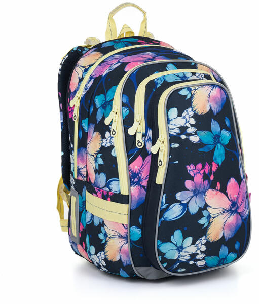 A kétrekeszes LYNN modell kínálatunk egyik legtágasabb darabja. A szivárványszínű virágokat sárga cipzárak egészítíik ki. Az iskolatáska hátsó rekesze keskenyebb. Ideális a legnehezebb tankönyvek vagy a füzettartó mappa hordozására. Az első rekesz a legszélesebb és egy praktikus, cipzáras hálós zsebbel rendelkezik. Az elülső rekesz és a táska elején lévő zseb k