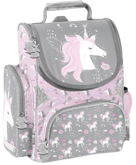 Ergonomikus iskolatáska – gerincbarát hátkiképzés, vastagon párnázott csípő-és gerincrész – Légáteresztő hátlappal – Több ponton állítható szivacsos vállpántok – Állítható magasságú mellpánttal – Oldalsó pánt a táska formájának megőrzésére – 3 nagy rekesszel rendelkezik, belül füzet elválasztó elem, rendszerező – Nagy rekeszében szivacsos lapt