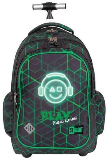 A St. Right - Stright gurulós iskolatáska, hátizsák - Play new level (673498) egy kényelmes, strapabíró táska, menő és színes mintával díszített. A könyvek, füzetek és a tolltartó 3 különböző méretű rekeszbe pakolható, a hátsó nagyban pedig elfér egy tablet vagy egy laptop. A főrekesz, a cipzár kialakításnak köszönhetően lakattal zárható . Kétoldalt egy-egy ki