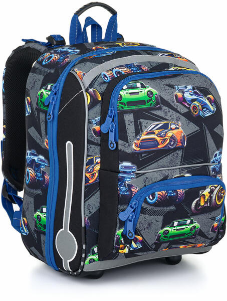 A BEBE modell egy kompromisszum a keményfalú iskolatáska és az iskolai hátizsák között, amelyet kifejezetten a 110 cm testmagasságú iskolások számára fejlesztettünk ki. A gyors és felturbózott autókat egy gumiabroncs alakú függődísz teszi egyedivé. Az iskolatáska egy nagy rekesszel rendelkezik, sárga vízálló rendszerezővel. A táska elején két további praktikus, cipz