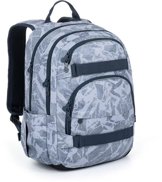 Tágas kétrekeszes diákhátizsák márvány motívummal. A hátizsák hátsó része párnázott és anatómiailag formázott. A hátsó rekeszben egy párnázott zseb található laptop és tablet számára, a második rekeszben pedig egy cipzáras zseb és egy kulcstartó. Ezenkívül a hátizsák elején két tépőzáras fogantyú található, amelyeken például egy kerékpáros sisakot tar