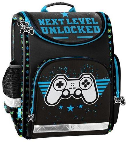 Game ergonomikus iskolatáska - Next Level felirattal a kisebb korosztály számára. Az ergonomikus megnevezés azt takarja, hogy a tervezés során figyelembe veszik a kisiskolás korú gyermekek testi adottságait és olyan hátizsákot készítenek, mely kíméli a gerincet, segíti a helyes testtartást. A könnyített (910 g) táska oldala merevített, hátsó része a gerinc két oldalán