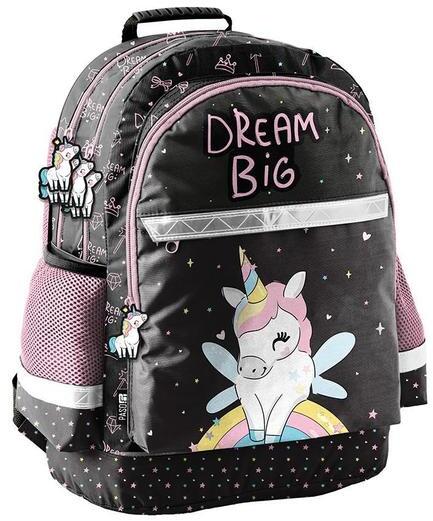 Az Unikornis iskolatásk a, hátizsák - 3 rekeszes - Dream Big menő szuperhős mintájával a kisebb korosztály ruhatárának trendi kiegészítője. A hátizsák 3 különböző méretű cipzáras rekesszel, elöl plusz 1 kisebb cipzáras zsebbel és 2 hálós oldalzsebbel rendelkezik. Az erősített, profilozott hátsó rész és a puha, állítható vállpántok a hátizsák viselését rend