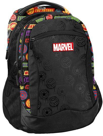 A BeUniq Marvel iskolatáska, hátizsák - 3 rekeszes - Jelvények (AV24XX-2808) menő Bosszúállós mintájával és vízlepergető anyagával a nagyobb korosztály ruhatárának divatos kiegészítője. A hátizsák 3 különböző méretű cipzáras rekesszel, elöl plusz 1 kisebb cipzáras zsebbel és 2 hálós oldalzsebbel rendelkezik. A fő rekeszben található egy laptop tartó- és egy m