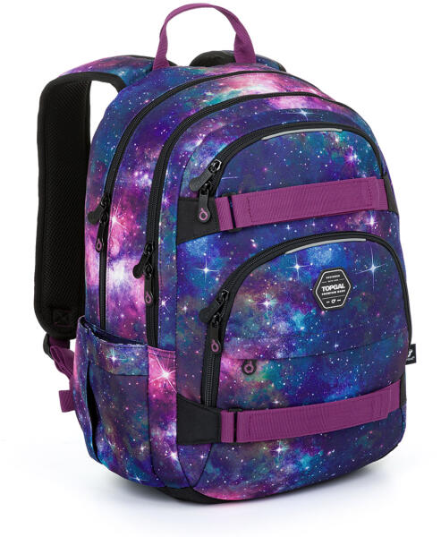 Tágas kétrekeszes diákhátizsák galaxis motívummal. A hátizsák hátsó része párnázott és anatómiailag formázott. A hátsó rekeszben egy párnázott zseb található laptop és tablet számára, a második rekeszben pedig egy cipzáras zseb és egy kulcstartó. Ezenkívül a hátizsák elején két tépőzáras fogantyú található, amelyeken például egy kerékpáros sisakot tarth