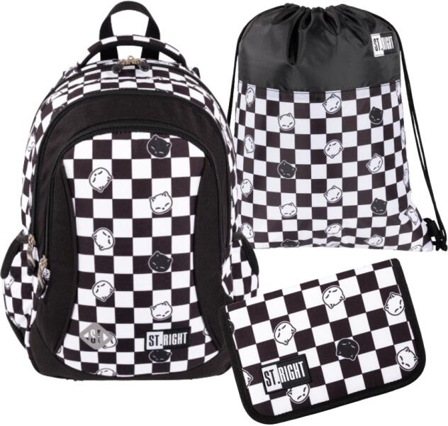 A fekete-fehér egy örök divat! Ez a szett egyszerre elegáns és menő, a cicaminták pedig kedvessé varázsolják ezt a szettet. Az ergonomikus iskolatáskát kihajtható tolltartó és praktikus tornazsák egészíti ki. St. Right Chess Cats ergonomikus iskolatáska A fekete-fehér kockák és néhány kedves cicafej teszi különlegessé ezt az ergonomikus kialakítású hátizsákot, melyn