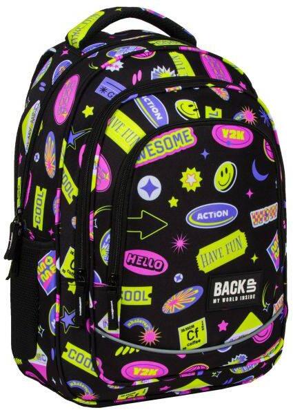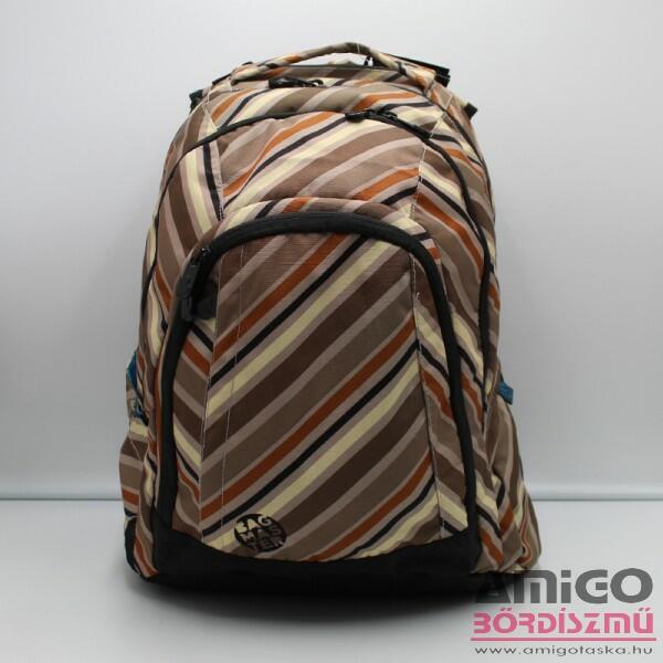 Hátizsák textil vízlepergető anyagból, szivacsos hát és vállkialakítással. Három cipzáros zsebbel, amelyből egyben praktikus rendszerezők találhatóak (kulcstartó, telefontartó, tolltartó, kisebb nagyobb fakkok). Egyik oldalán cipzáros, másik oldalán hálós italtartós zsebbel. 3év garancia