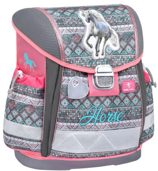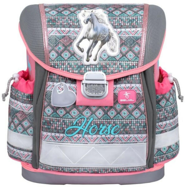 Dobogtassa meg lovakért rajongó kislánya szívét a Belmil Merevfalú iskolatáska Classy termékcsalád 403-13/AG Horse Aruba Blue AGR Tanúsítvánnyal rendelkező darabjával, amely ezúttal rózsaszín és szürke színekben pompázik, valamint csodaszép lovacskás mintát tudhat magáénak, hogy a sulis pillanatokat is feldobja a szabadság és a vágta erejének nőcis hangulatával. Am