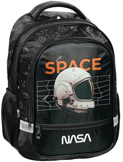 A Nasa ergonomikus iskolatáska, hátizsák - 2 rekeszes - Space (PP24SC-260) a kisiskolások számára. A hátizsák 2 cipzáras rekesszel , 1 kisebb, cipzáras zsebbel és két oldalsó hálós zsebbel rendelkezik. Hátoldala merevített, ergonomikus kialakí tású, vállpántja állítható hosszúságú, szintén szivacsos borítással. Vállpántját és elejét fényvisszaverő elemek dísz