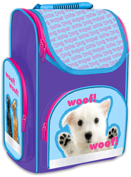 A Super cute dog iskolatáska (329138) kisiskolás korosztálynak készült. Elején és oldalán cuki kutyusok képe látható. A táska ergonómiailag tervezett, gerinckímélő kialakítású. Párnázott és légáteresztő hálóval ellátott hátsó része merevített, így kíméli a gyerekek gerincét. Párnázott vállpántja állítható, hogy több évig is használható legyen. Ezt a c
