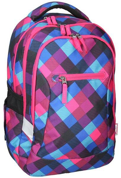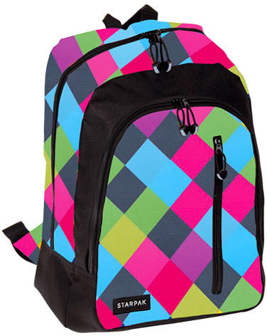 Spark színes, kockás hátizsák. A hátizsák két cipzáras rekesszel és egy kis szebbel rendelkezik. A táska vállpántja és háta párnázott. A táskán fényvisszaverő csíkok találhatók. Méretei: 43 x 32 x 13 cm.