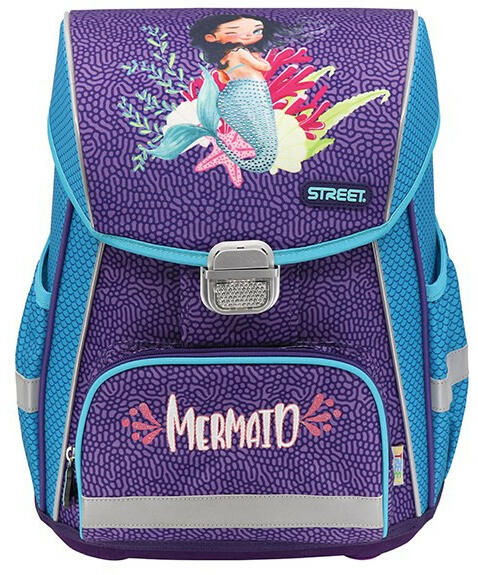 Iskolatáska STREET anatómiai Mermaid ABC Lila alapon sellő mintás 30,4L űrtartalmú hátizsák. Az egy nagy rekesz könnyen kezelhető záró csattal nyitható. Fényvisszaverő részek a vállpántokon és a táska elején. Ergonomikus kialakítású, párnázott hátrésszel. Réteges szilárd alsó rész a stabilitás érdekében. A vállpántok állítható csattal rendelkeznek. AIR-SYSTE