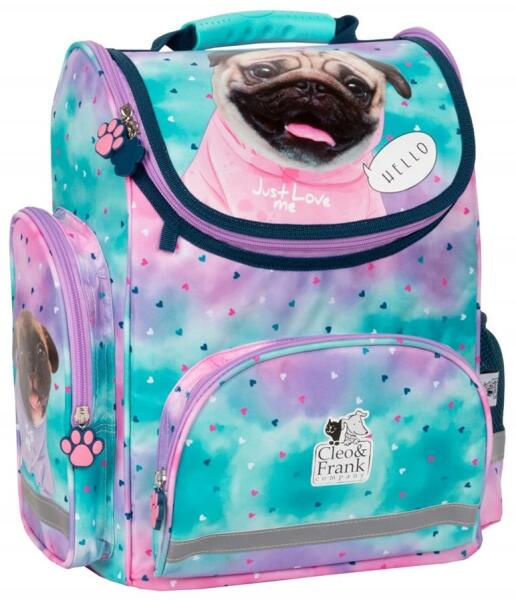 Cleo és Frank ergonomikus iskolatáska - Just love me cuki mopsz kutyus képével díszítve. Az ergonomikus megnevezés azt takarja, hogy a tervezés során figyelembe veszik a kisiskolás korú gyermekek testi adottságait és olyan hátizsákot készítenek, mely kíméli a gerincet, segíti a helyes testtartást. A táska oldala merevített, hátsó része a gerinc két oldalán és a derékn