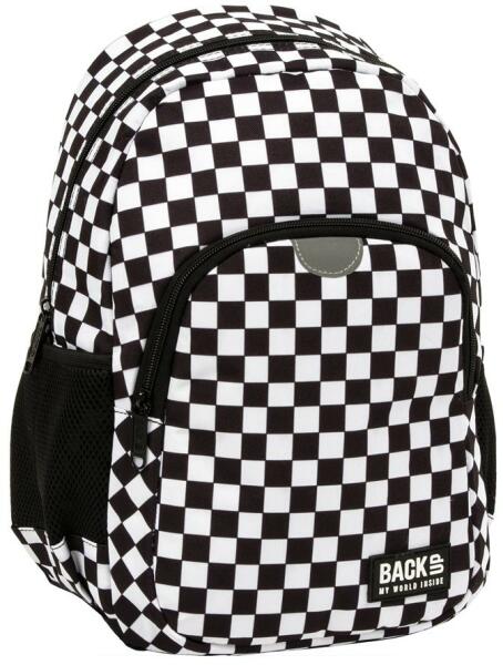A BackUp hátizsák mellpánttal - 1 rekeszes - Pepita trendi fekete-fehér mintákkal dekorálva a nagyobb korosztály ruhatárának kiegészítője. A hátizsák egy nagy rekesszel, egy kisebb méretű, cipzáras zsebbel és két kis hálós oldalzsebbel rendelkezik. A légáteresztő hálóval borított, szivacsos vállpánt állítható, a rajta lévő mellkaspánt tal pedig még kényelmesebb