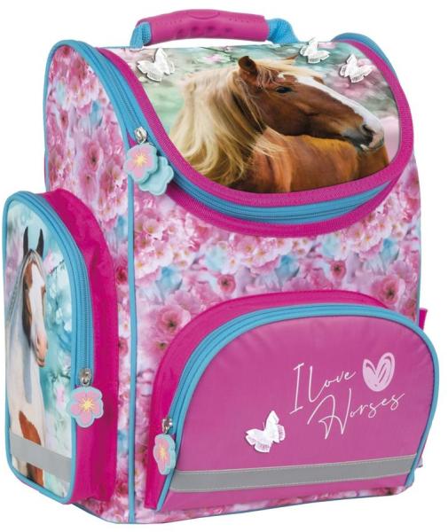 Lovas ergonomikus iskolatáska cuki lovak képével és virágmintával díszítve. Az ergonomikus megnevezés azt takarja, hogy a tervezés során figyelembe veszik a kisiskolás korú gyermekek testi adottságait és olyan hátizsákot készítenek, mely kíméli a gerincet, segíti a helyes testtartást. A táska oldala merevített, hátsó része a gerinc két oldalán és a deréknál erősen