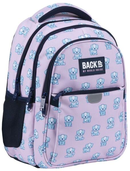 A cuki négylábúakkal díszített B ackUp Kutyás hátizsák - 3 rekeszes - Kutyuskák a kisiskolás lányok ruhájának divatos kiegészítője. A hátizsák 3 különböző méretű cipzáras rekesszel, elöl plusz 1 kisebb cipzáras zsebbel és 2 hálós oldalzseb bel rendelkezik. Hátoldala merevített, ergonomikus kialakítású, légáteresztő hálós szivaccsal. Állítható vállpántj