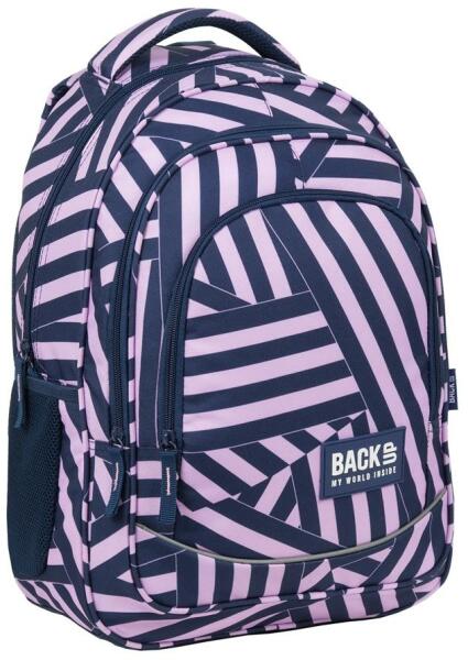 Hátizsák széles, egymást metsző csíkokkal, sötétkék és rózsaszín színkombinációban, Praktikus háromrekeszes iskolai hátizsák, elején cipzáras zsebbel. Az első rekeszben laptop és tablet tárolásához kialakított zsebek találhatóak. Mindkét oldalán hálós zsebek vannak, ahol kulacsot vagy összecsukható esernyőt lehet elhelyezni. Az iskolatáska elsősöknek is ajánl