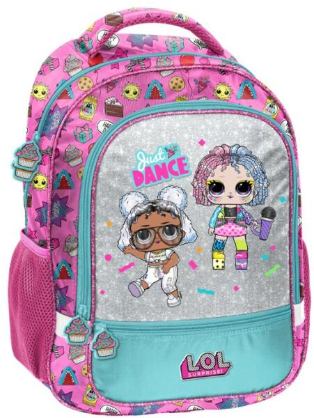 LOL Surprise hátizsák, iskolatáska - 2 rekeszes - Just dance elején az aranyos LOL babák képével. Az iskolai felszerelést két különböző méretű, cipzáras zsebbe lehet pakolni. Kétoldalt egy-egy kis hálós zsebben tárolható például az üdítős kulacs. A táska kézben és háton is kényelmesen hordható, hátoldala ergonomikus kialakítású. Állítható vállpánt ja párn