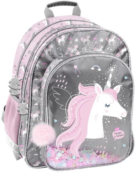 Az Unikornisos ergonomikus iskolatáska, hátizsák - 2 rekeszes - Make a wish (PP24JR-090) a kisiskolások számára. A hátizsák 2 cipzáras rekesszel , 1 kisebb, cipzáras zsebbel és két oldalsó hálós zsebbel rendelkezik. Hátoldala merevített, ergonomikus kialakí tású, vállpántja állítható hosszúságú, szintén szivacsos borítással. Vállpántját és elejét fényvisszaver