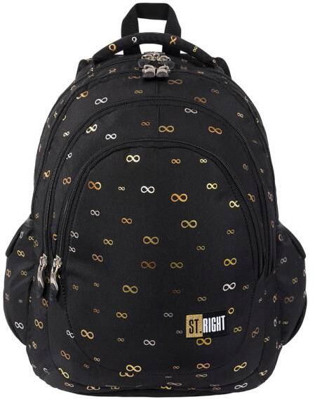 A St. Right - Infinity iskolatáska, hátizsák - 4 rekeszes a nagyobb korosztály ruhatárának divatos kiegészítője. A hátizsák 4 nagyobb méretű, cipzáras zsebbel és két kis hálós oldalzsebbel rendelkezik. Hátoldala ergonomikus kialakítású, légáteresztő hálós szivaccsal és mellpánttal . A belső zsebekben több kisebb rendszerező zseb, kulcstartó és mobiltartó is talá