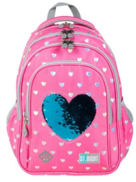 St. Right Sequin ergonomikus iskolatáska hátizsák 16" Hivatalos magyarországi forgalmazótól. Leírás: A St. Right Sequin egy rendkívül különleges táska, köszönhetően az elülső részen lévő strasszos szívnek. A szív átsimításával a strasszok egyszínű kékről ezüst színűre változnak és a kép közepén megjelenik majd egy szerelmes macska pár. A táskát körbe kise