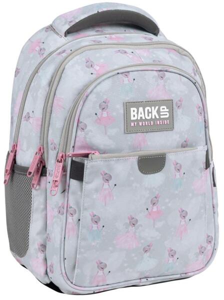 A nyuszis BackUp hátizsák a kisiskolás lányok ruhájának divatos kiegészítője. A hátizsák 3 különböző méretű cipzáras rekesszel, elöl plusz 1 kisebb cipzáras zsebbel és 2 hálós oldalzseb bel rendelkezik. Hátoldala merevített, ergonomikus kialakítású, légáteresztő hálós szivaccsal. Állítható vállpánt ja szivacsos, légáteresztő hálós fedőréteggel, diszkré