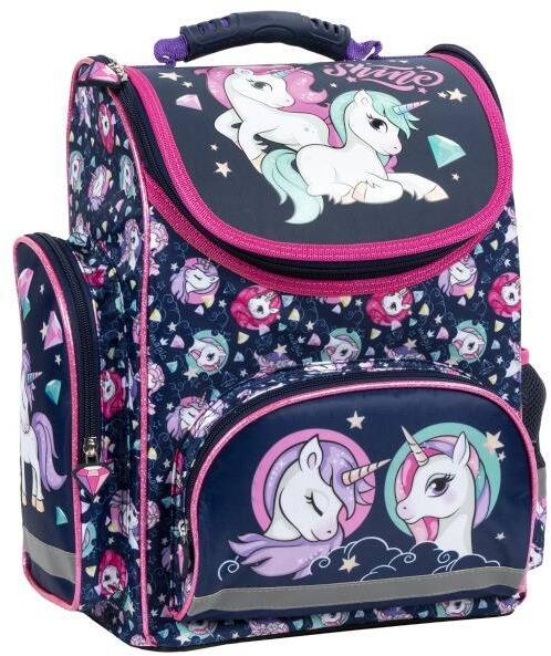 Az Unikornis ergonomikus iskolatáska - Shine tündéri egyszarvúak képével díszített. Az ergonomikus megnevezés azt takarja, hogy a tervezés során figyelembe veszik a kisiskolás korú gyermekek testi adottságait és olyan hátizsákot készítenek, mely kíméli a gerincet, segíti a helyes testtartást. A táska oldala merevített, hátsó része a gerinc két oldalán és a deréknál