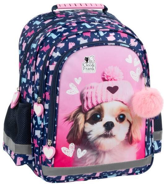 Cleo és Frank kutyás iskolatáska, hátizsák - rózsaszín a kisiskolás korosztály számára. A hátizsák elejét egy édes kiskutya képe díszíti, a könyvek, füzetek és a tolltartó 3 különböző méretű zsebbe pakolható. Kétoldalt egy-egy kis hálós zsebben tárolható például az innivaló. Szivacsos hátsó része ergonomikus kialakítású, légáteresztő anyagú. Állítha