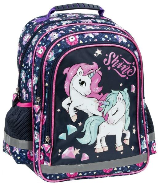 A Unikornis iskolatáska, hátizsák - Shine a kisiskolás korosztály számára ajánlott. A színes hátizsákot aranyos unikornisok képe díszíti. A hátizsákban a könyvek, füzetek és a tolltartó 3 különböző méretű zsebbe pakolható. Kétoldalt egy-egy kis hálós zseb ben tárolható az innivalós kulacs. Hátsó része szivacsos, ergonomikus kialakí tású, mely kíméli a kisis