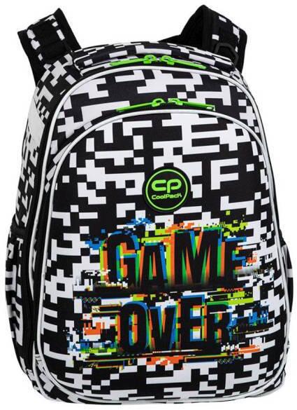 A közkedvelt videojáték klasszikus mintájával dekorált Coolpack - Turtle ergonomikus iskolatáska, hátizsák - 2 rekeszes - Game Over a kisiskolás korosztály ruhatárának div atos kiegészítője. A hátizsák 2 különböző méretű, cipzáras rekesszel rendelkezik . Két nagy rekeszében könnyedén elfér az A4 -es formátum, ami az iskolai tankönyvek hagyományos mérete. A hátizs