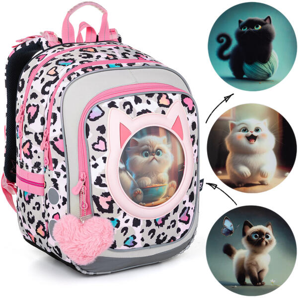 Fő jellemzői:súlya 1 kg préselt anatómiailag formázott hátrész merevítéssel két rekesz egy kis elülső zsebbel állítható magasságú mellkaspánt a vállpántok végei mágnesekkel vannak ellátva (a libbenő végek könnyebb rögzítéséhez) fényvisszaverő elemek - az iskolatáska elején és oldalán, valamint a vállpántokon esőgátló bevonat TOPDURA anyagból készült, l