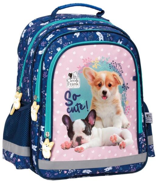 A Cleo és Frank kutyás iskolatáska, hátizsák - So cute a kisiskolás korosztály számára ajánlott. A szép szín-összeállítású hátizsákot édes baba kutyusok képe és apró virágminták díszítik. A hátizsákban a könyvek, füzetek és a tolltartó 3 különböző méretű zsebbe pakolható. Kétoldalt egy-egy kis hálós zsebben tárolható az innivalós kulacs. Hátsó része