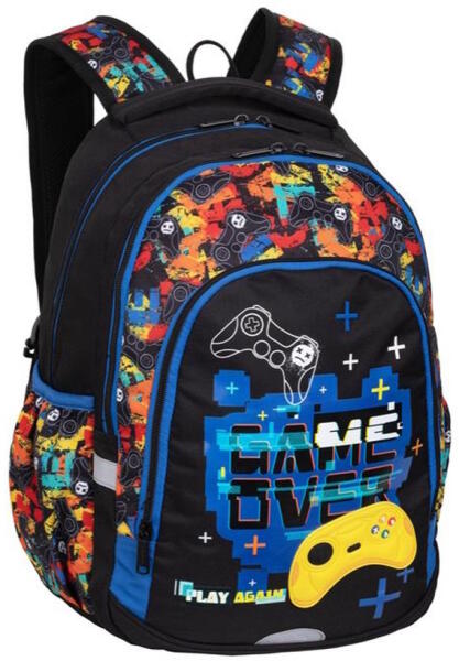 A vagány videojátékos mintával díszített Coolpack - Colorino Primer ergonomikus iskolatáska, hátizsák - 2 rekeszes - Game a kisiskolás korosztály ruhatárának div atos kiegészítője. A hátizsák 2 különböző méretű, cipzáras rekesszel, és egy első cipzáras zsebbel rendelkezik . Két nagy rekeszében könnyedén elfér az A4 -es formátum, ami az iskolai tankönyvek hagyomá