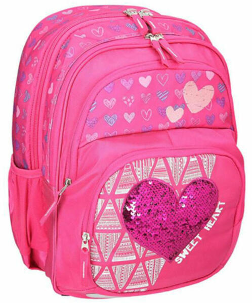 A 3 rekesszel és egy kisebb cipzáros zsebbel ellátott Spirit Rózsaszín flitteres szívecske mintás ergonomikus hátizsák tökéletes választás kislányoknak iskolatáskának vagy mindennapos használatra is. A legnagyobb rekeszbe a tankönyveket, a kisebbekbe pedig a füzeteket, tolltartót és uzsonnát rendszerezetten lehet bepakolni. Oldalán 2 gumis zseb lett kialakítva, melybe kulac