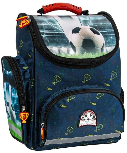 A Focis ergonomikus iskolatáska - Football vagány színekben, focilabda képével díszített. Az ergonomikus megnevezés azt takarja, hogy a tervezés során figyelembe veszik a kisiskolás korú gyermekek testi adottságait és olyan hátizsákot készítenek, mely kíméli a gerincet, segíti a helyes testtartást. A táska oldala merevített, hátsó része a gerinc két oldalán és a deré
