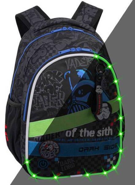 A Coolpack - Jimmy LED-es iskolatáska, hátizsák - 2 rekeszes - Disney - Star Wars a kisiskolás korosztály ruhatárának divatos kiegészítője. A hátizsák 2 különböző méretű, cipzáras rekesszel rendelkezik. Két nagy rekeszében könnyedén elfér az A4-es formátum, ami az iskolai tankönyvek hagyományos mérete. A hátizsák oldalán két zseb található, amelyekben szabadon és