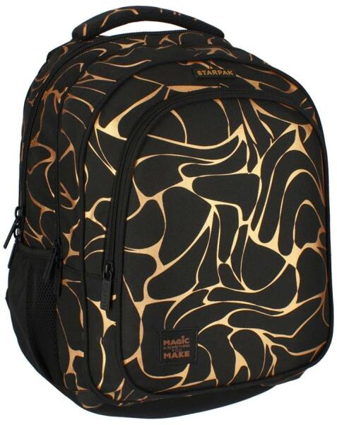 Nagyméretű Magic iskolatáska, hátizsák - 2 rekeszes - Gold a nagyobb korosztály számára készült. A hátizsák 2 nagyobb méretű rekesszel, egy külső cipzáras és két kisebb hálós oldalzsebbel rendelkezik. Hátoldala ergonomikus kialakítású, légáteresztő hálós szivaccsal. A belső zsebekben több kisebb rendszerező zseb, kulcstartó és mobiltartó is található. Állíth