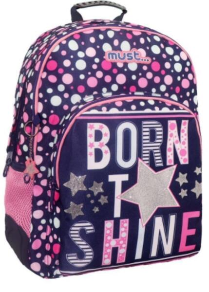 Must Energy: Born To Shine ergonomikus iskolatáska hátizsák Hivatalos magyarországi forgalmazótól. Leírás: Born to shine, vagyis "Csillogásra születtél" felirat látható ezen a különleges iskolatáskán, mely biztosan elnyeri majd a gyerekek tetszését. A táskán a nagy központi felirat mellett látványos, színes pöttyök láthatóak. Az iskolatáska ergonomikusan kialakított