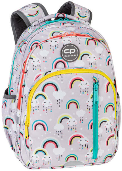 A Coolpack - Base ergonomikus iskolatáska, hátizsák - 2 rekeszes - Rainbow Time a kisiskolás korosztály ruhatárának div atos kiegészítője. A hátizsák 2 különböző méretű, cipzáras rekesszel rendelkezik , valamint egy első kisebb rekesszel. Könnyedén elfér benne az A4 -es formátum, ami az iskolai tankönyvek hagyományos mérete. A hátizsák oldalán két zseb található, a