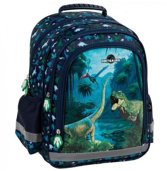 Dinoszauruszok iskolatáska, hátizsák - kék a kisiskolás korosztály számára. A hátizsák elejét félelmetes dínók képe díszíti, a könyvek, füzetek és a tolltartó 3 különböző méretű zsebbe pakolható. Kétoldalt egy-egy kis hálós zsebben tárolható például az innivaló. Szivacsos hátsó része ergonomikus kialakítású, légáteresztő anyagú. Állítható vállpánt