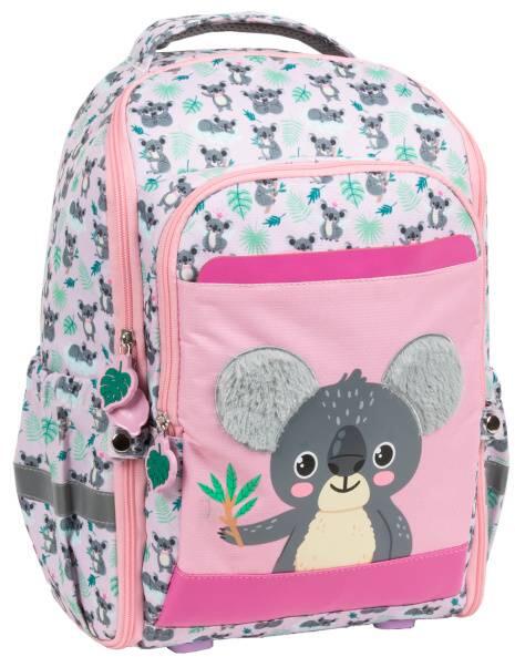 Koalás iskolatáska, hátizsák - 1 rekeszes (PLSZKOA10) koalamacis mintával díszítve, a kis állatok rajongók ruhatárának divatos kiegészítője. A hátizsák 1 nagyobb méretű, cipzáras rekesszel, 1 külső cipzáros zsebbel és 2 kisebb oldalzsebbel rendelkezik. Hátoldala merevített, egyterű belsejében laptop- vagy tablettartó zseb is van. Hátoldalán puha vállpánt, tetején e